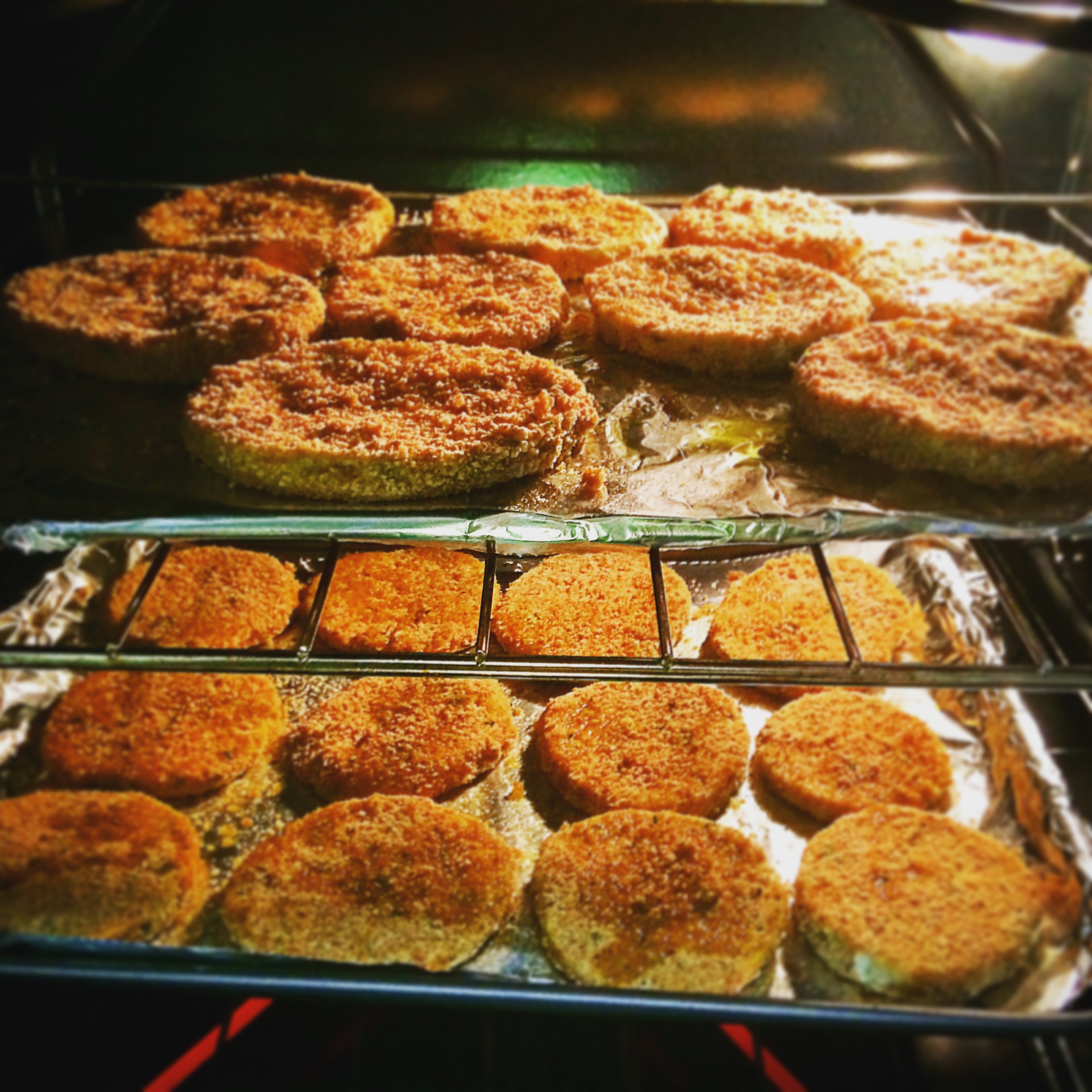 I have no idea what made me think of eggplant, since I usually detest eggplant (it’s so slimy and bitter and weird, right?). But regardless, my mind went to eggplant, so I didn’t resist. I decided to try to make eggplant parmesan, and the result was absolutely delicious–exactly what I was going for–flavorful, salty, savory, just a little spicy, and most importantly, oh-so-crunchy! Here’s how I did it: