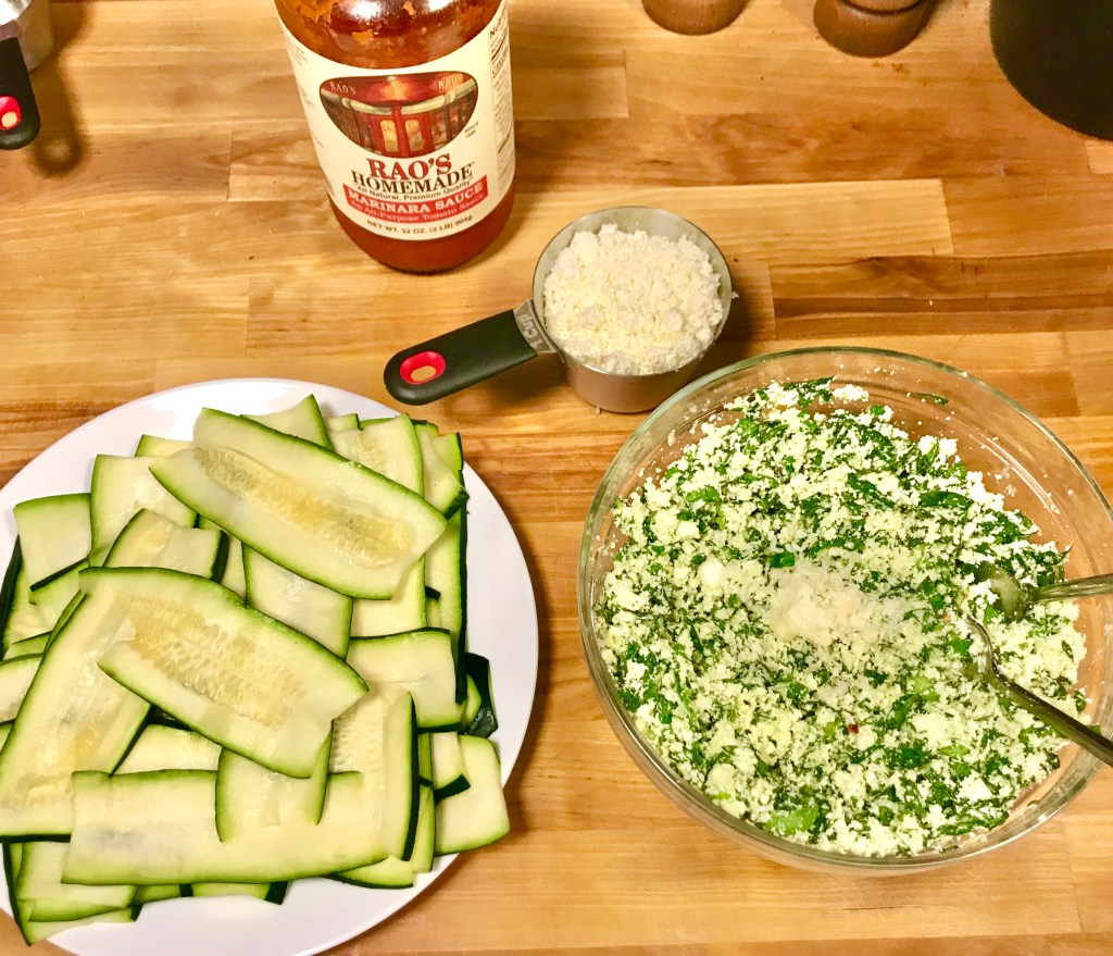 - Slice zucchini length-wise into about 1/8-inch slices (preferably with a mandolin). Mine mandolin’s currently in storage, so I just used a knife.