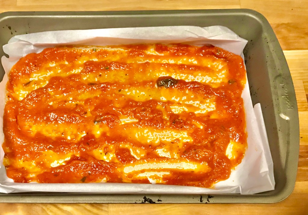 - Spread a thin layer of marinara on the bottom of an 8 x 8 pan. (You can use a larger pan – you’ll just have some extra room left.)