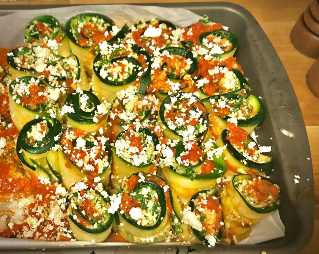 - Now you can start the rolling process! Take a slice of zucchini, and spread a thin layer of cheese mixture from edge to edge. Pat down gently. Spoon a thin layer of marinara on top of cheese mixture.