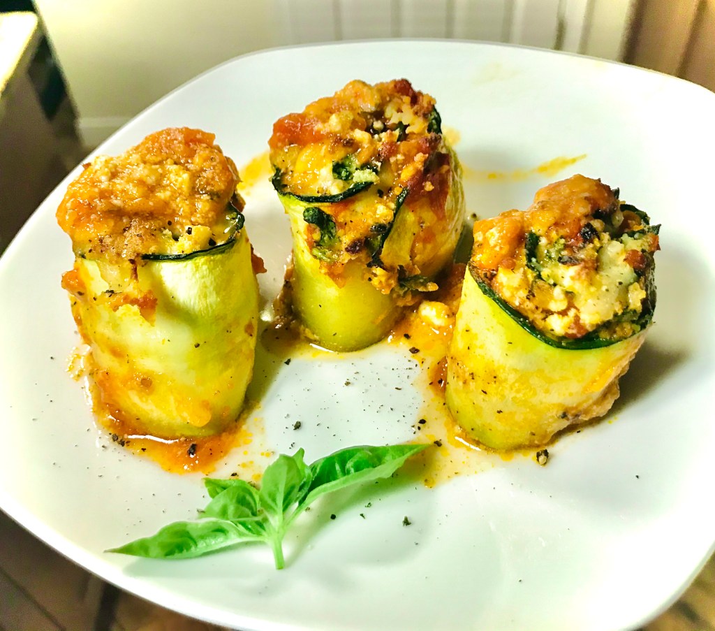 One of my favorite comfort foods is lasagna – layers of pasta filled with cheese on cheese on more cheese. But because of how rich and decadent I like my lasagna, it’s usually more of a special occasion treat than a typical weeknight meal. Last night I found myself wanting the flavors of lasagna but in something a bit lighter. The result was Zucchini Lasagna Roll-ups, and they were delicious. Usually I add meat, but I didn’t have any on hand, so I made a vegetarian version. But I wasn’t the least bit disappointed, and if you’re a meat eater, I promise you won’t be either!