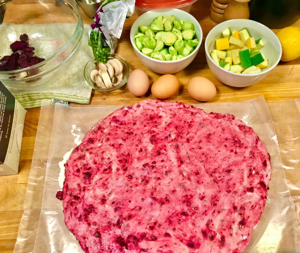 - Puree the beets. I planned on pureeing the beats, but my blender was in the dishwasher, and I was too impatient to wait. Mashing them wasn’t bad, and I actually liked the texture of having small bits of beet in the crust, but I would’ve preferred for the color of the crust to be more even and less splotchy-looking.