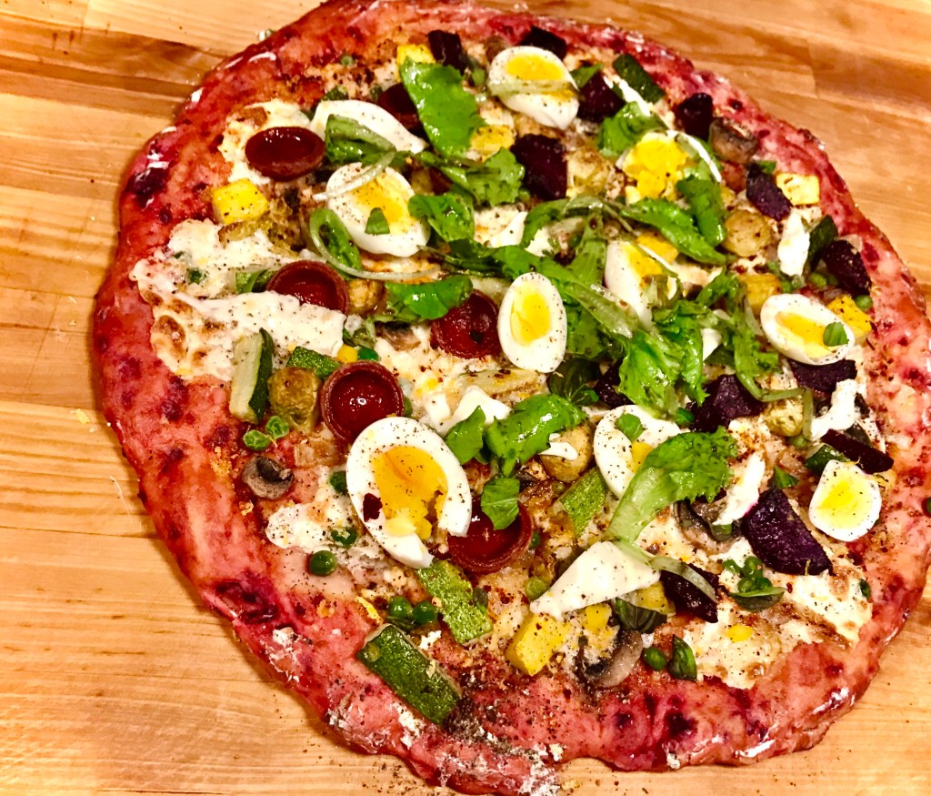 - Top and serve. When the pizza is done, remove from oven, and arrange egg slices and beet slices over the top. Let cool for 10 minutes. Garnish with chopped fresh basil leaves, salt and pepper and crushed red pepper (optional). I topped mine with some greens dressed in olive oil and balsamic vinegar for added freshness and some acidity. Enjoy!